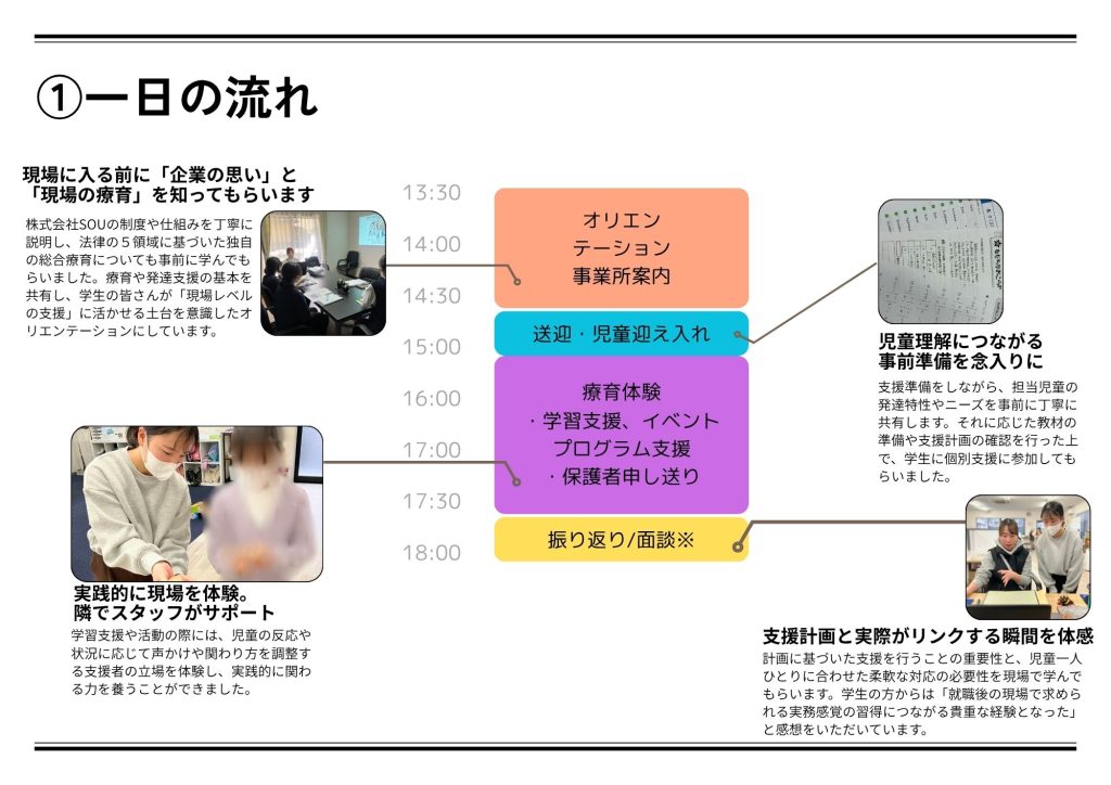 SOUのインターンシップでは、実際の子どもたちとの関わりを通じて、仕事の喜びや大変さを肌で感じられる時間がたっぷりあります。さらに、職員との交流の場を通して「働くイメージ」を掴んでもらうことができるようミーティングやプログラム作りにも参加してもらっています。