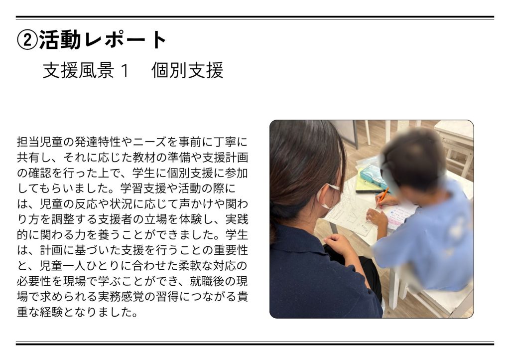 大学院の授業の中で、児童発達支援や放課後等デイサービスの仕事に興味を持った。児童が過ごしやすい環境調整を丁寧にされていたり、個々のつまずきやニーズに応じた支援をしたりしていることがよくわかった。3日間のインターンシップを通して、その困り感を減らす具体的な取り組みを学ぶことができ、非常に有意義な時間を過ごすことができた。(夏季・鳴門教育大学大学院)