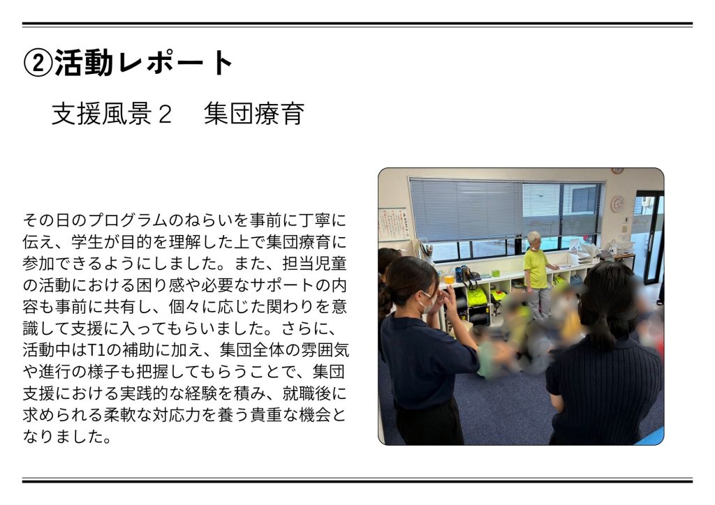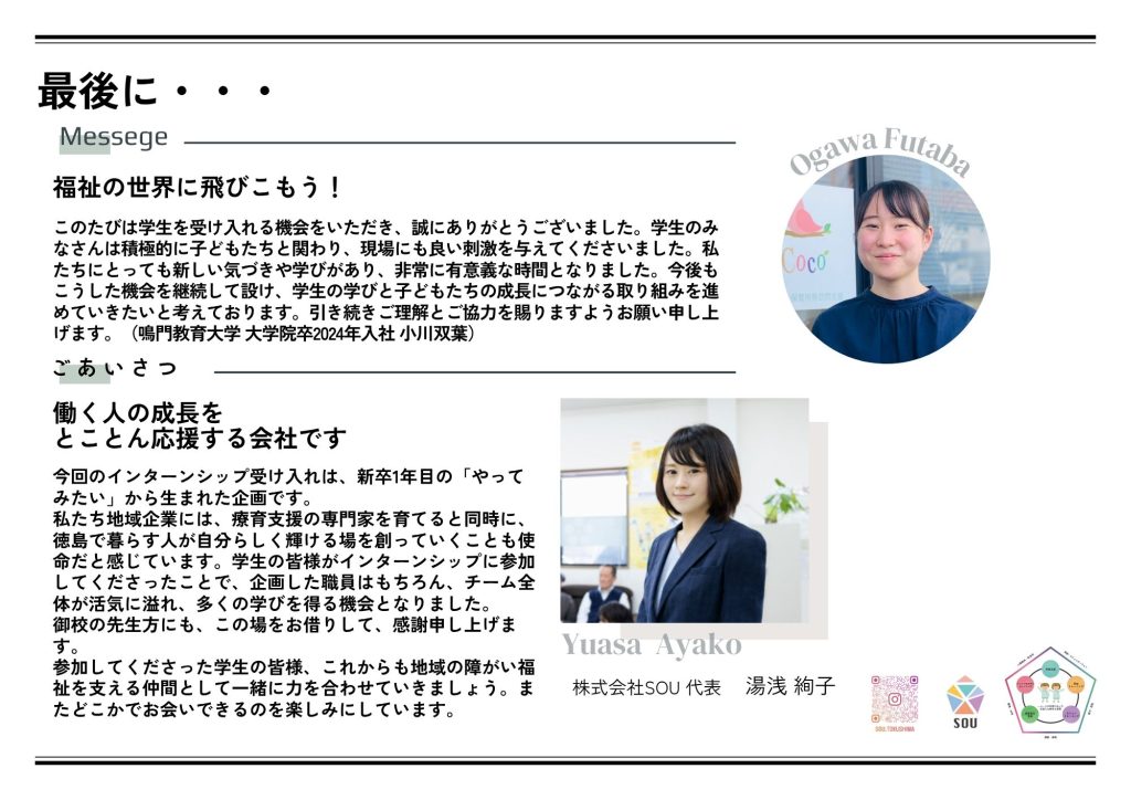 このたびは学生を受け入れる機会をいただき、誠にありがとうございました。学生のみなさんは積極的に子どもたちと関わり、現場にも良い刺激を与えてくださいました。私たちにとっても新しい気づきや学びがあり、非常に有意義な時間となりました。今後もこうした機会を継続して設け、学生の学びと子どもたちの成長につながる取り組みを進めていきたいと考えております。引き続きご理解とご協力を賜りますようお願い申し上げます。(鳴門教育大学 大学院卒2024年入社 小川双葉)