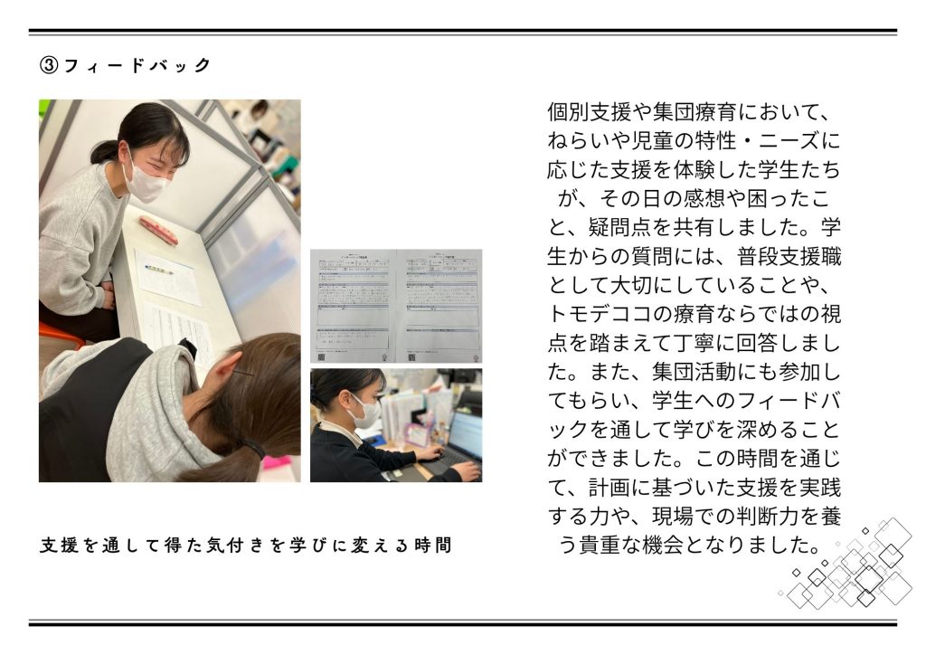 児童の迎え入れ、療育体験の準備、現場での実践にも積極的に参加してもらい、最後には、必ずフィードバックの時間を確保。