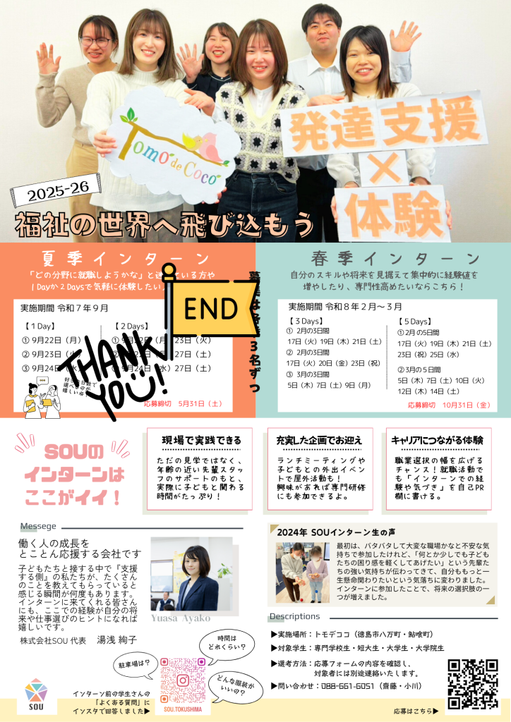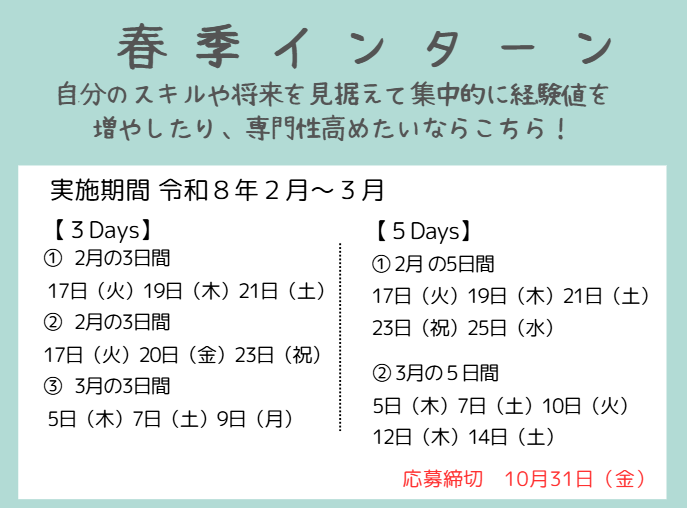気になる方は、まずはSNS「インターン学生さんからの質問に答えます!」でチェックしてみてくださいね。https://www.instagram.com/p/DJamkXtBslk/?hl=ja&img_index=1